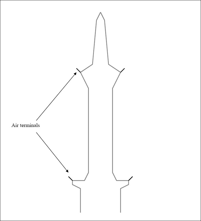 terminals (i.e. lightning rods) should be installed at the tips of all protrusions on the sides of