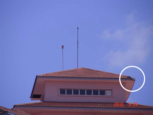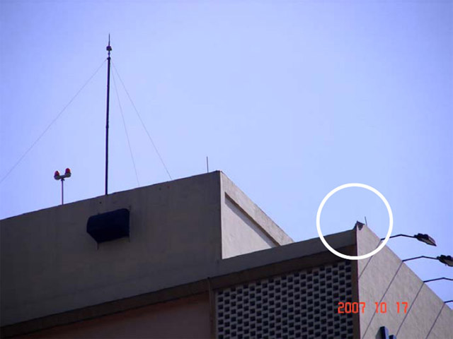 The bypasses that occurred on the minaret of the Putra Mosque are not unique events since dozens of other similar bypasses have been observed and photographed on other buildings. They occurred well within the claimed protection zones of the ESE air terminals. A few examples of these bypasses and the nearby ESE air terminals are shown below (Figs. 12a to 12d):
