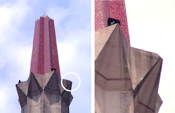 The horizontal concrete protrusions below the apex originally have pointed tips when